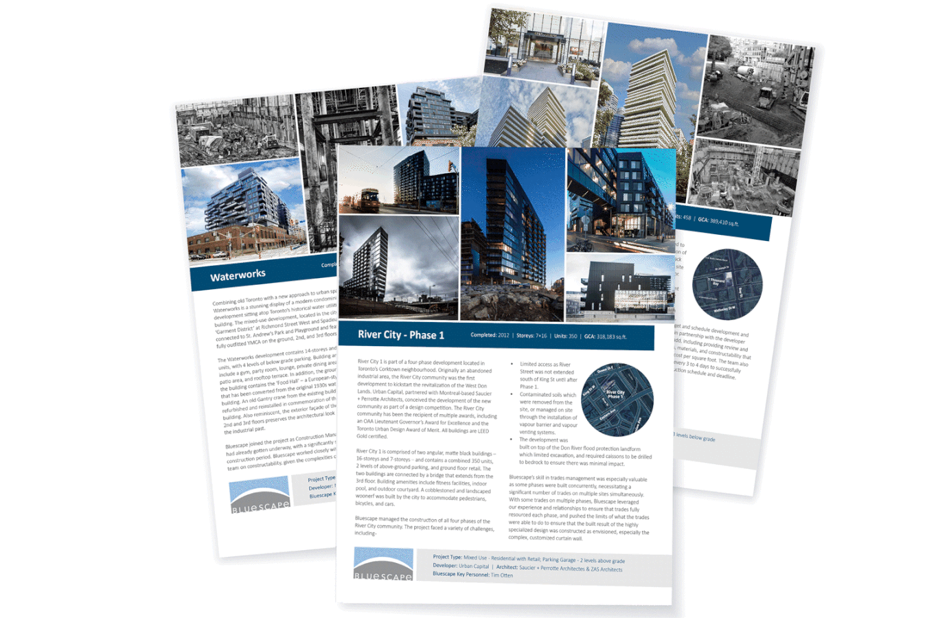 Bluescape is an established Toronto-based construction manager firm specialized in high-rise, residential and mixed-use developments in urban spaces. The firm was established in 2008 and had recently undergone a shift in management with the retirement of the original founding partner. The five current partners were seeking to manage the change and elevate the firm’s presence in the market. Evenden & Co worked with Bluescape to develop corporate messaging that demonstrated the firm’s expertise and unique market position and create or refresh materials which supported the firm’s ambitions.